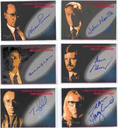 There is a basic set of 72 cards, which show scenes from the movie, background shots and an index card. Then there is an "black oil" set, M1 to M6, set you have to warm these cards up with your hand to reveal the picture. Finally there are the 6 autograph cards.