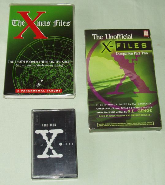 The final 4 tapes are adapted from the Unofficial X Files Companion by N. E. Genge. There are two tapes from the first book with an overall running time of 6 hours. This is divided into 4 tapes in two boxes. The first is a traditional box and read by Bob Sherman. The second tape is in a larger card box and strangely read by Nana Visitor (Kira from DS9) and Dwight Schultz (Barclay from The Next Generation). The third and fourth tapes are taken from the second and third book of the series and are both read by Bob Sherman.