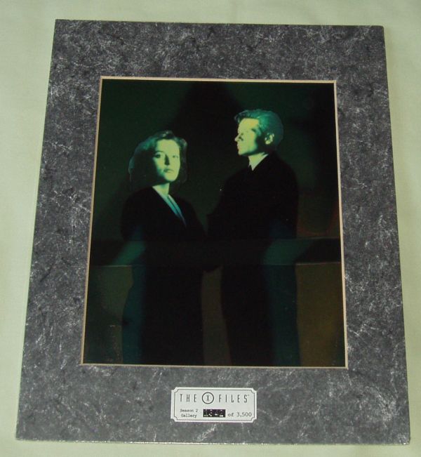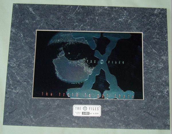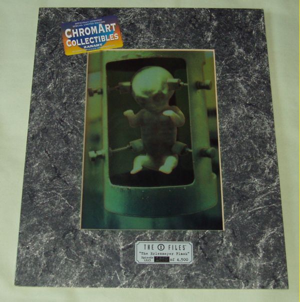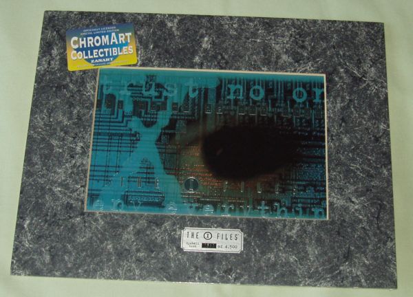 I have nine Chromart prints. These are rather nice and are limited editions. Trust no One is a montage of X-File legend, computer chips the X and the eye and the words Deny Everything and Trust no One. Erlenmeyer Flask is a picture of the alien creature in the flask. Squeeze is Tooms himself coming down a chimney. Mulder and Scully standing in front of a doorway in green and yellow light. Duane Barry laying on an alien operating table. There is a second season Mulder and Scully and finally a Topps first-issue comic cover. Season 3 gallery is a portrait of Mulder and Scully. X and eye logo with the words trust no one in red.