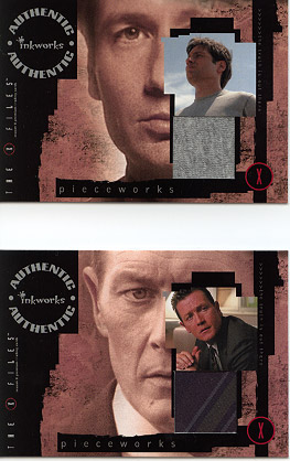 These cards have authentic pieces of screen-worn clothing. Dogget's tie and Mulder's Tshirt.